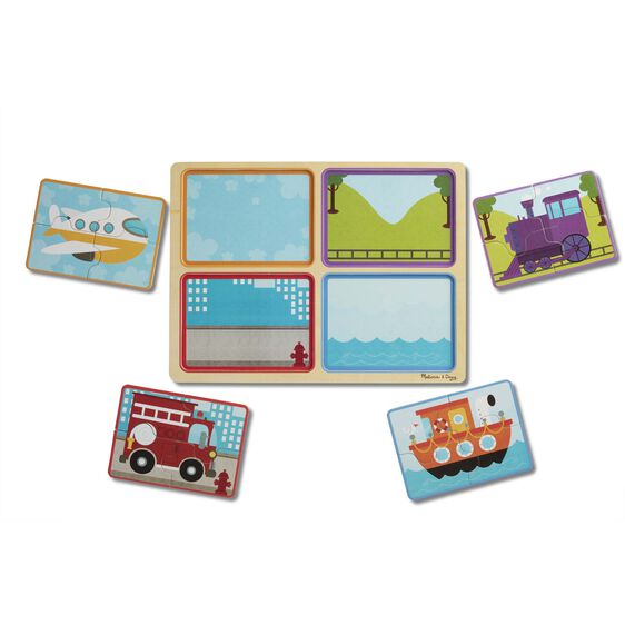 Four 4-piece wooden puzzles with a vehicle theme; vehicles include plane, train, fire truck, and boat